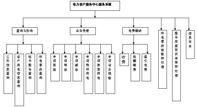给用户提供一个电话语音界面,用户电话打入系统后,能够在系统提示语的引导下进行自助式服务,亦可转人工服务。如电话打入系统后,立即得到一个响应:“您好!电力系统客户服务中心,故障申报请按1,业务受理请按2,投诉申报请按3,业务咨询请按4,电费查询请按5,转人工服务请按0”用户选择相应的语音菜单,获取相应的服务。电力客服应包括以下几大类功能:查询与咨询服务,业务受理服务,收费、提醒缴费和催缴电费的服务,停电事故报修和处理,服务质量投诉举报和处理,信息发布,服务分类统计和分析,服务质量的监控和考核。参见下图所示: