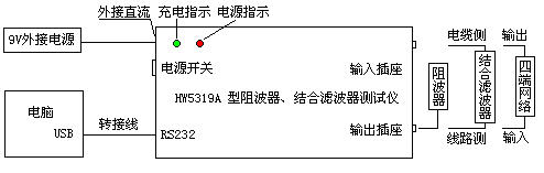 测量方法非常简单,按图(1)所示,用同轴电缆线连接被测设备,用RS232通信电缆连接笔记本电脑USB口或COM口;打开软件,按照提示操作就行了。