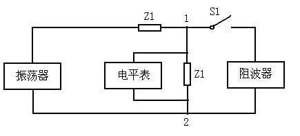 测量阻波器分流损耗的原理图如图(2),Z1为线路特性阻抗的等效电阻,如为400Ω,振荡器输出+6dB信号,电平表在1-2 处测得的电平为0dB,合上S1由于阻波器的分流,电平表的指示会减小,减小值就是分流损耗,改变频率就可以直接显示阻波器分流损耗的曲线。