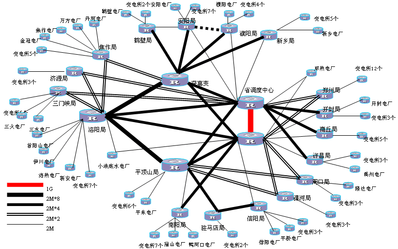 河南电力调度数据专用网络的各核心层之间采用8X2M方式连接,核心层与骨干层以及骨干层与骨干层之间采用4X2M方式连接,接入层采用2M或2X2M方式连接。