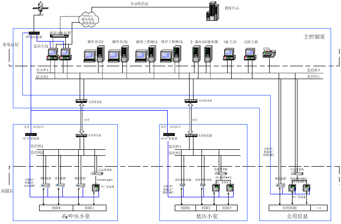 在这个系统方案中,站控层设备布置在主控制室,间隔层设备大部分分布在离一次设备比较近的二次设备小室中。小室按照电压等级或者间隔划分,相关间隔的二次设备布置在小室中。站控层网络采用双以太网结构,小室之间通过光纤以太网通信,每个以太网使用独立供电的交换机,光纤收发器等通信设备。小室内可配置带一个或者两个光纤口的交换机,主控制室配置交换机和收发器一体化装置或者以太网交换机和光纤收发器。