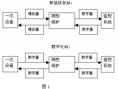 信息后,就地转换为数字量,通过光缆上传测控保护装置,然后传到后台监控系统,而监控系统和测控保护装置对一次设备的控制也是通过光缆传输数字信号实现其功能。常规综自站与数字化变电站对比如图1所示。