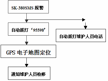 GPS电力网地理信息系统电子地图定位,获取报警主机的电话号码,同时自动跳出报警的位置图(SK-380SMS型报警主机安装位置,警情发生地点在电子地图上自动闪烁),值班人员根据警情发生位置通知维护人员现场检修。报警主机一般都安装在分支线路上,如果是线路主干从中间被盗,则其下端分支线路上的报警器都报警;如果分支线路被盗,则本条线路上的报警器报警。工作人员可根据报警器报警情况迅速判断是主干线路发生问题还是各分支线路发生问题,及时快速通知管理单位人员迅速赶到现场,制止控制破坏分子对电力设施的破坏或及时消除线路故障,减少损失。报警主机内置高性能可充电