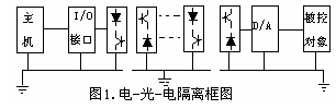 信息交换均经过两次电—光—电的转换。如图1所示;一套光电耦合器放在模/数转换器一侧,一套光电耦合器放在主机一侧。系统中有三个不同的地端,一是主机与I/O接口公用的“计算机地”,一个是传输长线使用的“浮空地”,另一个是模/数转换器和被控对象公用的“现场地”。采用这种两次光电隔离的办法,把传输长线隔浮在主机与被控对象之间,不仅有效地消除了公共地线,抑制了由其引进的干扰,而且也有利于解决长线驱动与阻抗匹配的问题这样就保证了整个控制系统的可靠运行。
