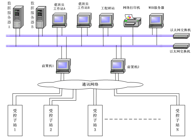 1.监控系统应采用分布式网络结构, 数据及进程可动态迁移,极大地发挥硬件资源的潜力,提高系统的可靠性,优化系统性能。建议的网络结构如下图: