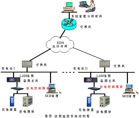 实现对放电模块控制的功能由安装与现场的放电控制模块完成,放电控制模块接收远程放电开始和终止命令的同时,分别根据内阻测试和核对性放电命令,完成对JM、J1-2、J1-2、J1-5直流接触器的闭合和断开操作,整个远程控制系统的结构图如图四所示。