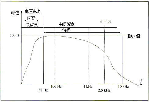 如果出现频率小于50Hz的谐波,称为分数次谐波,即在0Hz~50Hz之间,幅值范围和谐波电压相同,而谐波电流则小于额定电流。