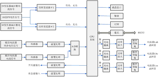 从2#变压器6KV侧(6301)、3#变压器6KV侧(6401)取电流信号,从III段PT柜(6302)取电压信号,经功率变送器计算出有功量和无功量,再送到CPU系统进行处理。