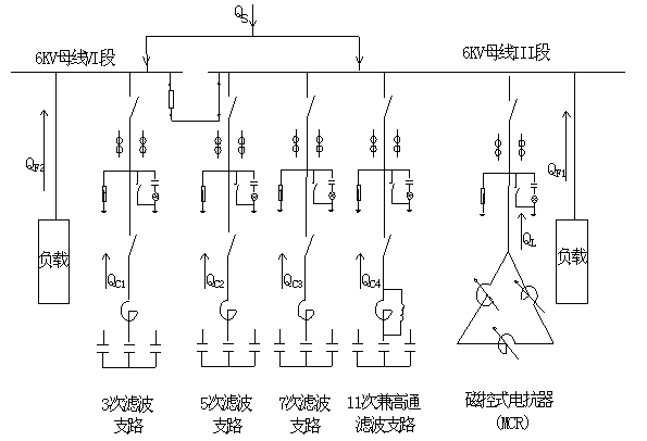 6KV母线上装有3次、5次、7次和11次兼高通的滤波支路,其作用是为MCR支路和负载产生的谐波电流提供一个低阻抗通路,使谐波电流和电压对供电系统的影响减少到最小。