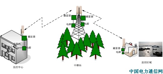 根据需求,整个系统是一个无线网络远程监控系统。在该无线网络远程监控系统中设置1个前端监控点,位于沈家门半升洞客运码头附近,通过此前端监控设备采集该处海底电缆所处海域的船只活动,以达到对其全面、安全的监控;由于监控点与监控中心非视距,因此在中途要架设一中继站对信号进行中转;数据图像最终传输至监控中心。使用监控中心的监控服务器对该监控点进行监控,通过屏幕实时显示出前端监控点的情况。此方案对沈家门半升洞客运码头海底电缆的状况可以方便的进行即时监控和记录。