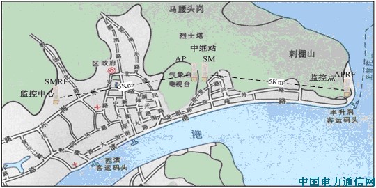 根据实际要求,图像传输大小控制在4CIF(704*480),即每个监控点每秒所需实际带宽为8KB*8bit*25帧=1.6Mbps,所以本方案所提出监控点使用APRF提供的7M双向带宽可行。半升洞客运码头附近海底电缆所处海域监控点,中继站没有监控点,作为纯粹的中转站在此方案中使用SM接收来自监控点APRF传来的信号,再使用AP转发信号至监控中心。监控中心使用SMRF(加反射板)接收来自中继站的信号,再使用监控软件将视频信号在屏幕上显示。