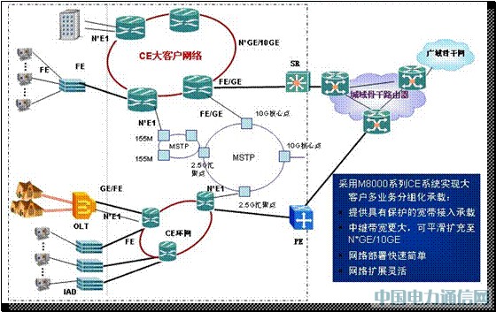 用户末端覆盖和业务接入方面的实现方式多种多样:既可在业务种类单一时采用光纤连接方案,也可像图中所示的在业务种类复杂时采用N×E1、以太网交换机、路由器、EPON等技术作为末端接入。大客户接入点的不确定性,决定多种网络拓扑形式并存的现状。