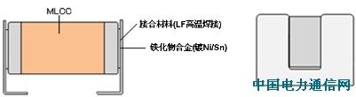 金属端子通过接合材料(LF高温焊接)与电容器的外部电极相结合,使金属端子成为接合电路板的媒介。金属端子的形状采用能够降低啸叫效果的U字形。它只是与电容器上压电效应比较小的WT面外侧部分结合,从而减低电容器振动的传递。