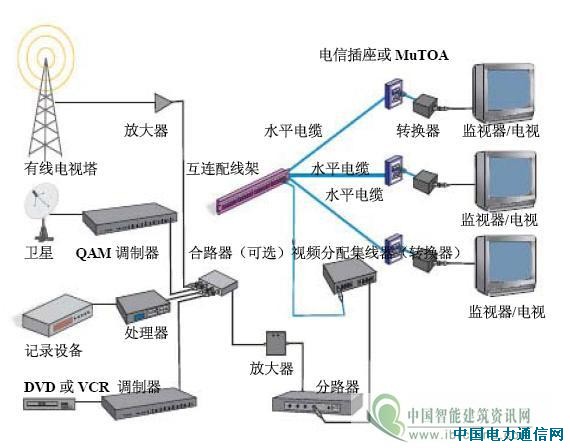 支持多种宽带视频应用的结构化布线解决方案的典型系统拓扑图如图3所示。宽带视频分配的一个结构化布线的方法提高了可靠性,因为视频分配集线器和电视或显示器之间没有分接头或分路器。另外,由于每台观察装置使用一条专用电缆,有新的电视和/或监视器添加到系统时,现有连接点的信号强度不受影响。