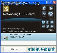 相对来讲,从以太网口转换出USB口是比较不通用的、非主流的技术。早期的类似产品称为USB打印服务器(USB PRINTER SERVER)。之所以称为USB打印服务器而不是USB服务器或者以太网/USB转换器是因为这些产品生成的USB口只能够支持USB打印机,甚至只支持某些品牌的某些型号的打印机。由于USB远程应用中许多都是打印机,所以这些产品今天仍然广泛应用。用电缆传输的以太网的最远距离为150米。现在USB口的应用已经越来越广泛,比如说,我们经常用U盘、USB摄像头等。幸运的是,USB网络服务器(也称为:以太网/USB转换器)技术和产品也在进步,我们对最新的一款NETWORKING USB SERVER(USB网络服务器)的产品(如图3)进行了测试,该产品支持USB存储盘、USB/串口转换器、USB摄像头等,当然也支持USB打印机,符合USB2.0协议,也可以接USB-HUB扩展USB口。这款产品的默认IP地址为169.254.10.10,注意计算机的以太网口地址段的前2位要一样。比如在产品的USB插座上外插U盘,配套的软件“Lanch Networking USB Server”(如图4)会显示已经连接U盘。打开计算机的“资源管理器”就可以读写这个U盘了。如果外插USB/串口转换器,配套软件还会提示安装转换器的驱动程序。