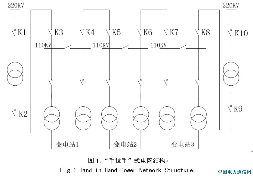 目前,国内电网部分110kV变电站没有真正实现双电源供电。即不是直接从220kV变电站引来,而是多座变电站串接在两座220kV变电站中间,简称为“手拉手”式闭环连线开环运行结构。正常时,两端电源供电,中间的两座变电站间联络断路器断开。如下图1结构。K1~K4,K6~K10闭合,K5断开,假设左侧220kV变电站停电,变电站1内的备自投无法控制K5,导致变电站1,左侧220kV变电站全站停电。如何解决这一问题,即检测、判断故障,通过何种方式传递、变换站间信息,以便隔离故障,提高供电可靠性,一直是一个难题。笔者针对这个问题,联合邯郸市德普电力自动化设备有限公司,上海安科瑞电气有限公司研制了“基于光纤通信交互式远方自投装置”,很好的解决了这一问题。