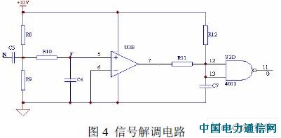 信号解调电路的功能主要是把低压电力线上调制的信号从电力线上解调出来,发送给P89LPC932,供微控制器进行相应的处理。其硬件原理图如图4 所示: