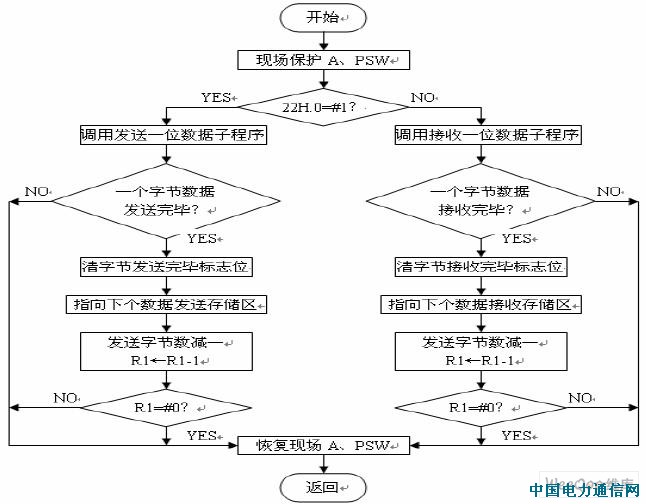 载波数据的发送和接收是在在微控制器P89LPC932外部中断子程序中实现的。其程序流程图如5所示: