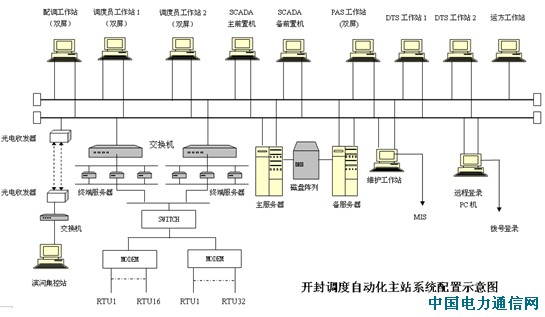 自动化主站系统采用国电南瑞电网控制公司生产的OPEN2000系统。系统硬件采用双机、双网热备用方式,软件采用UNIX操作系统、TCP/IP网络协议及关系型数据库ORACLE,配以Motif风格人机界面功能,有效保证了系统的实时性、稳定性和可靠性。