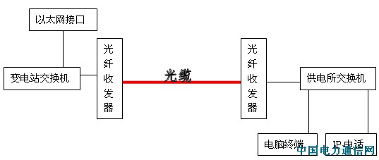 经过此次事故以后,我们对供电所和变电站之间的网络传输采取了一些措施:在供电所和变电站之间增加一对光纤收发器,在站所之间敷设光缆来代替原有的网线。如下图所示: