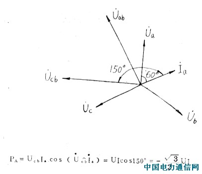 依次将电能表的A相电压端子或C相电压端子引线断开,电能表转盘应仍转动。若断A相,转盘不转动,说明第二元件的电流回路可能有断线或短路等现象。若断C相,转盘不转动,说明第一元件的电流回路可能有断线或短路等现象。但是要注意一点,当现场COSФ的值接近0.5(感性)时,第一元件的计量功率本来就是零,为了防止误判断,可在断开C相电压的同时,将C相电压接到A相电压端钮,此时的相量图如下:
