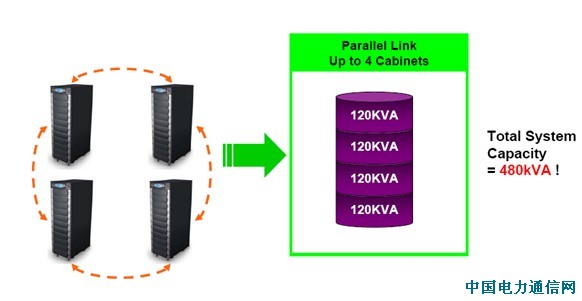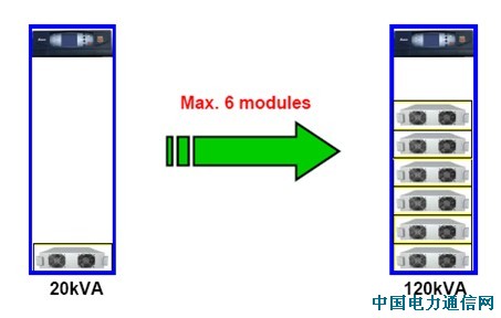 HIFT(海福)UPS因采用模块化结构,可以在20kVA到480kVA的宽广范围内,以20kVA为单位来随时随需在线扩容,客户不再需要仅是为未来的可能性而提前投入大笔费用。(见下图)