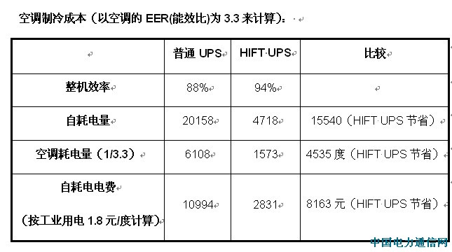 根据上述计算,采用HIFT UPS与普通UPS相比较,仅从电费这一项上来计算,