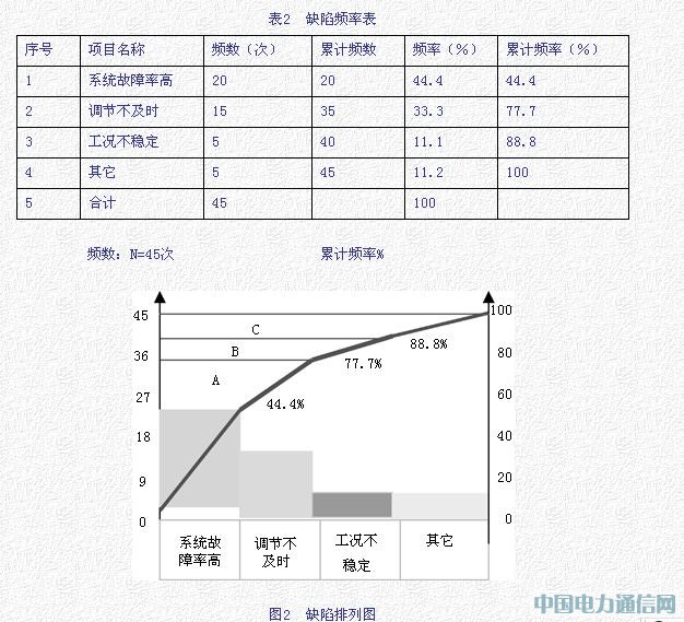由排列图找出了控制系统存在的两个主要问题,系统故障率高、调节不及时的问题非常突出,占所有缺陷的77.7%。