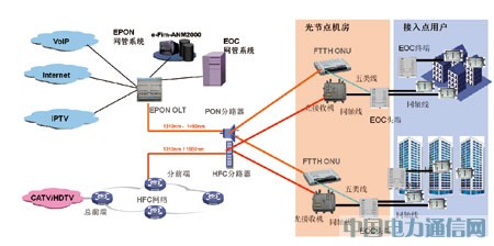 对于广电运营商来说,“三网融合”后,如何快速地对现有网络进行双向化改造,开展互动电视、宽带上网、语音接入等新业务,是当务之急。而由于资金、技术、人才的缺乏,不可能花重金打造高质量的电信网络,只能利用现有网络资源,挖掘潜力,逐步建设。因此,现阶段可以最大限度利用HFC网络的潜力,采用EPON+EOC的模式,快速进行HFC网络的双向化改造。