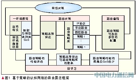 针对复杂的网络环境,如何适应环境,充分利用链路资源、网络资源、用户资源,获得端到端的优化目标是路由算法需要解决的问题。依据认知网络的定义,我们给出了基于策略的认知网络的路由算法框架,如图1所示。该框架包括如下几个功能模块。