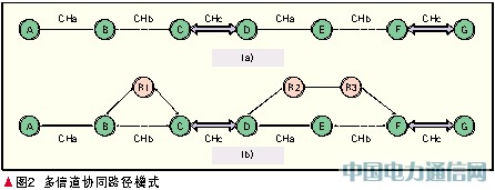 路由策略库可以包含常规的路由协议,如IP协议。亦可设计一些适于异构网络环境的新型路由协议,如适应新物理层技术MIMO的路由算法,支持链路协同、网络协同的跨层路由算法[6]。图2给出了一种自组织网络中的链路协同方案。在自组织网络的任意两个节点之间,多跳链路可组成端到端的多信道“协同路径”。在图2(a)中,同路径上的相邻链路配置了不同的信道,当节点以半双工模式协同工作时,链路A-B、C-D与E-F或链路B-C、D-E与F-G可同时工作,提升了路径的流量,获取了“协同路径”增益。当路径上的信道配置与路径附近区域的信道配置发生冲突时,可构建类似图2(b)所示的协同路径,当链路B-E不能履行路由任务时,利用中继节点R1构建备用链路,获取“协同路径”增益。