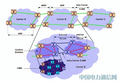 根据ITU-T G.8080和G.7715,OIF E-NNI的参考模型如图5所示。在这个参考模型中需要在三个层面运行路由协议,即运营商间的E-NNI,运营商内的E-NNI和I-NNI。EBGP是运营商间的E-NNI的主要候选路由协议。在I-NNI可以使用任何私有的路由协议,因此不需要标准化。所以OIF的主要工作是制定运营商内的E-NNI路由协议。