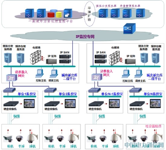 系统采用城市安防视频监控管理平台在市局、分局、派出所三级分布式部署架构实现整个城市监控点大联网,市局设立监控中心实现全局控制和调度;区县局设立监控中心管辖本区域内的视频监控点,受市局统一管理,同时各区县局要实现资源共享;派出所管辖本区域内视频监控点。