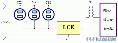 当电视机用的插座CZ1、CZ2、CZ3(当然还可以设计安装更多的电源插座,只要所用的LCE功率允许)中的任意一只插有电视机的电源开关合上时,共用天线放大器的电源就自动供电。这样既不会浪费电能,又不影响电视机用户,且无须专人管理。