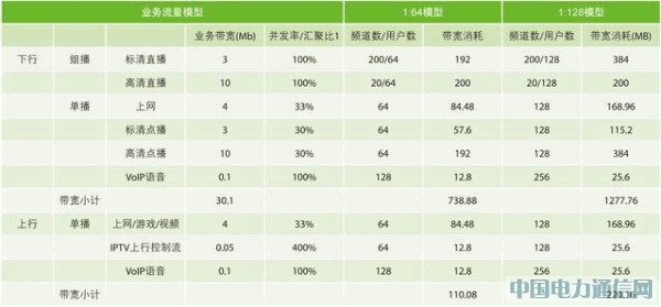 按照带宽计算模型,根据每用户带宽需求与并发率综合测算:基于1: 64分光比模型,用户总下行带宽738.88MB,总上行带宽110.08MB,平均每用户下行11.5MB,上行1.72MB;基于1: 128分光比模型,用户总下行带宽1277.76MB,总上行带宽220.16MB,平均每用户下行9.9MB,上行1.72MB,单PON 口下行带宽不能满足要求。