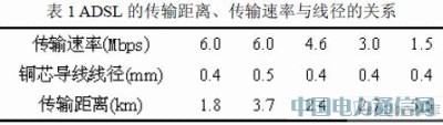 ADSL系统的传输信号的最长距离因线径的粗细、信号传输速率的高低而有所不同。其对应关系如下表1所示。