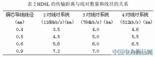 HDSL系统常采用的线路码型有两种:2B1Q码和CAP码。2B1Q是无冗余的四电平脉冲码,属基带传输码,即用1位四进(quaternary)码组表示2位二进制(Binary)码组。CAP(Carrierless Amplitude/Phase modulation)码是无载波调幅调相技术,有冗余调码,属带通型传输码。在HDSL系统中,CAP码常和时间压缩调制TCM(Time Compression Modulation)结合使用。CAP的功率频谱滤除了低频和高频部分,克服2BIQ的缺点,因而传输距离远,误码率低,抗干扰能力强,对外界干扰小。由于CAP码带宽较2BIQ减小一半,使传输速率提高一倍。采用CAP码的HDSL系统在两对双绞线上传输时,其传输性能优于2B1Q 编码的HDSL系统传输性能。由于历史原因,早期HDSL系统采用2B1Q码,因而已经在市场上占有一席之地。例如百灵(PairGain)、RAD、台联(Tainet)、AT&T等很多厂家都提供采用2B1Q编码的HDSL系统。而CAP编码技术出现得晚一些,加之技术较为复杂,成本相应略高,但相同传输速度情况下,采用CAP编码的HDSL比采用2B1Q编码的HDSL传输距离长40%左右,所以,CAP编码将成为的HDSL的主流。HDSL支持的最大传输距离与其系统的线径及线对数量有关,如下表2所示: