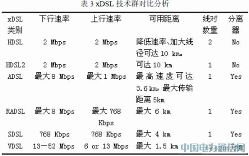 除了上面提到的ADSL和HDSL技术以外,xDSL技术群还包括RADSL(速率自适应非对称数字用户环路)、SDSL(单线数字用户环路)、VDSL(宽带接入技术)。下面对xDSL技术群做一个总结,其结果如下表3所示。