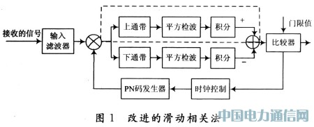 在此,采用基于功率谱估计的改进捕获算法。采用上通带和下通带两个窄带滤波器,分别对其滤出的信号功率谱进行分析和估计,如图1所示。其中,上支路为传统串行单积分滑动相关法,该支路用于滤出解扩后信号功率;下支路用于滤出解扩后上通带以外噪声的一部分功率作为估计。在低信噪比的电力线环境下,利用上下通带内外功率差代替传统使用带内信号功率作为同步门限比较器输入值的方法,降低了同步虚警率,并提高了同步的检测概率。