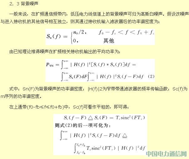 扩频系统使用的通信频带主要在100~450 kHz。在这个频带上,低压电力线上的噪声可以分为背景噪声、与工频同步的周期性噪声、突发性噪声、频域窄带脉冲噪声4类。其中,背景噪声对电力线扩频通信的影响最大。在扩频频带内背景噪声基本保持水平状态,其特性为平稳的高斯白噪声;与工频同步的周期性噪声持续时间长,频域覆盖范围广,功率大。但高传输速率的通信系统由于数据包持续时间短,可在周期性噪声的间隙进行传输,从而降低了这种噪声的影响;突发性噪声的能量主要集中在100 kHz以下,且其产生的频率与每秒几千比特的数据传输率相比很低,因而对扩频传输系统的影响不是很大;频域窄带脉冲噪声的特点是:一旦产生,持续时间长,能量大。如果通信系统采用单频载波,且载波频率恰好落在这种窄带噪声的频率上,那对此系统的通信传输影响很大。