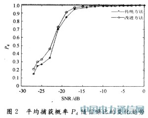 由图2可以看出,当信噪比较高的时候,改进方法与传统方法相比,其优点并不突出,当信噪比低于一18 dB后,改进捕获方法比传统方法的捕获概率高。可见,在信噪比较低的情况下,改进的方法比传统的方法有更高的捕获概率,能够有效地提高系统的检测概率和捕获性能。