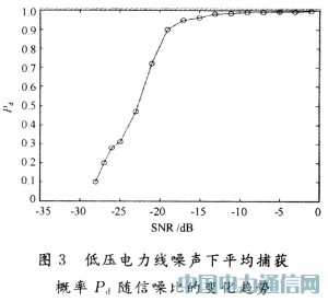 由图3可以看出,改进的捕获算法加入低压电力线信道噪声后,其同步捕获概率相对于图3的改进算法,并无明显变化。由此可见,该改进的捕获算法适用于低压电力线上。