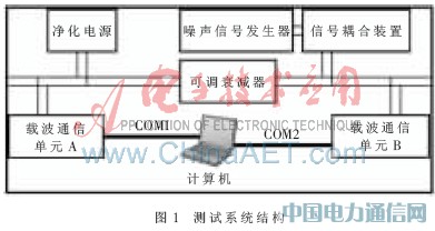 本文设计的点对点通信测试系统是在低压电力线信道环境下,测试2个载波通信单元的点对点通信的能力。电力线信道的环境复杂,负载变化大,会造成电力线信道的多径产生,并且由于各种开关电源等影响,信道环境中存在脉冲干扰、周期性噪声等干扰源。这些干扰对通信性能有很大的影响,而且由于信道中传输的报文数据的长度不同,产生的影响也各不相同。目前,国内外的各类报导中关于低压电力线信道的建模很少,因此在这种复杂的信道环境下测试通信单元的通信性能(比如误码率)是非常有必要的。通过这类测试,不仅可以纵向比较自身载波通信单元的点对点通信能力,还可以横向比较不同厂家各个类别的载波通信单元在相同的信道环境下点对点通信性能,为整体通信系统的改进和设计提供一定的指导依据。