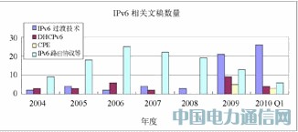 如果算上BCP,Informational,Experimental等状态的RFC,截至2010年5月31日,IETF已发布了与IPv6相关的RFC 268个 ,除去已废止的49个,共有219个RFC。从图1可见,目前研究热点已经从IPv6基本路由协议,转向IPv6过渡技术,IPv6用户端设备(CPE)标准,IPv6接入认证(DHCPv6)等领域。