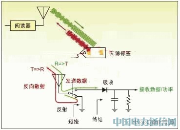 图1:无源标签对射频 RF能量进行整流并调制信号,然后反向散射反射给阅读器。