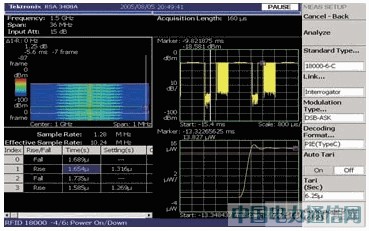 预编程测量能减少进行这些测试所需的建立时间。例如,ISO18000-6 C 类型的一个重要测量是启动时间和关闭时间。载波能量上升时间必须足够快以保证标签采集到使其正常工作的充足能量。信号也必须迅速达到稳定状态。发射结束时,载波能量下降时间必须足够快,以防止其他发射受到干扰 [参阅图3]。