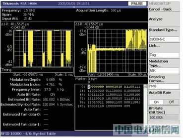 RTSA 也能解调与标签查询相关的符号或比特。用户只需选择相应的 RFID 标准、调制类型和解码格式。分析仪能自动检测并显示链路的比特率。为进一步提高工程师的生产效率,对恢复出的数据符号进行了基于功能的颜色编码(color-coded)。RTSA 能够自动识别前导符并将那些符号染成$。这易于识别实际的数据负荷并与已知值进行比较。