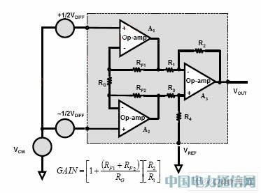 图1:三运放仪表放大器,其VCM为共模电压,而VDIFF为相同仪表放大器的差动输入。
