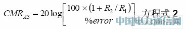 具体而言,将R1:R2同R3:R4匹配至关重要。结合A3,这4个电阻从A1和A2的输出减去并增益信号。电阻比之间的错配会在A3输出端形成误差。方程式2在这些电阻关系方面会形成CMR误差: