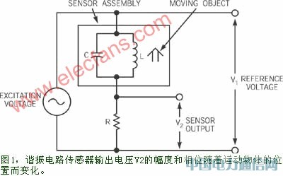 可变电阻传感器可以将一个固定的直流激励电压或电流变换成一个被测量直接函数的电流或电压。在另一类传感器中,移动物体或流体可以通过改变一个LC电路的电感值或电容值来产生一个传感器信号。图1示出了一个基本的交流驱动调谐电路接近式传感器(即L和C)以及采样电阻器R。在静态条件下,L和C谐振并在某一频率下具有最大阻抗。当一个物体接近该传感器时,L或C值发生变化并改变电路的谐振频率。只要用一个固定频率来激励传感器,并测量输出电压V2相对于激励电压V1的相位或幅度变化,就可以推导出该物体的位置。不过,这种方法会限制传感器的动态范围和分辨率。